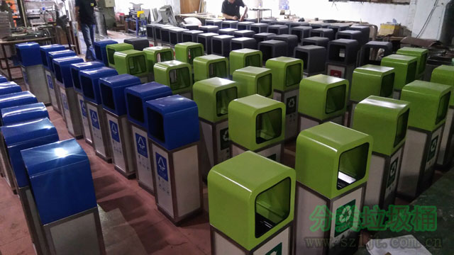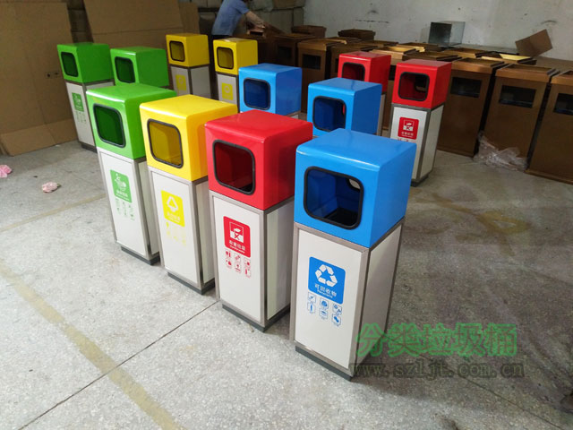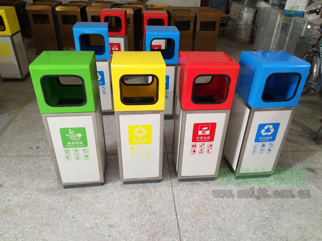這批垃圾桶是供商場及其附近的商業(yè)街適用,適用鋼板材料,外表烤漆成綠黃紅藍四色,分別代表廚余垃圾,其他垃圾,有害垃圾,可回收垃圾,分類明確詳細,有利于人們垃圾分類減量。由于采用鋼板烤漆材料,所以垃圾桶防水防曬防腐蝕,再加上其本身的外觀設(shè)計大方典雅,所以室內(nèi)戶外都能夠適用。