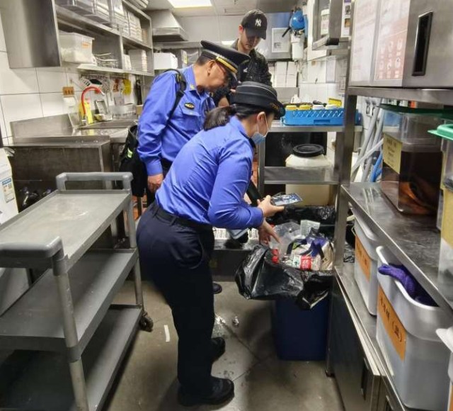 檢查過程中,工作人員深入門店后廚,查看商鋪內垃圾分類情況。檢查內容包括垃圾分類投放情況、垃圾純凈度、垃圾分類容器配置、標志標識規范、垃圾分類申報情況,以及店員垃圾分類知曉度情況等。執法隊員對在檢查過程中,發現部分餐飲店存在未按規定設置垃圾分類收集容器、垃圾混投等行為,進行了嚴厲的處罰,共處罰分類投放1起,處罰申報7起,處罰缺桶4起,并要求商家限期整改。同時,工作人員向沿街商鋪發放了垃圾分類宣傳冊,并現場講解生活垃圾分類投放和回收等知識,普及垃圾分類有關法律法規,增強沿街商鋪人員生活垃圾分類的意識。