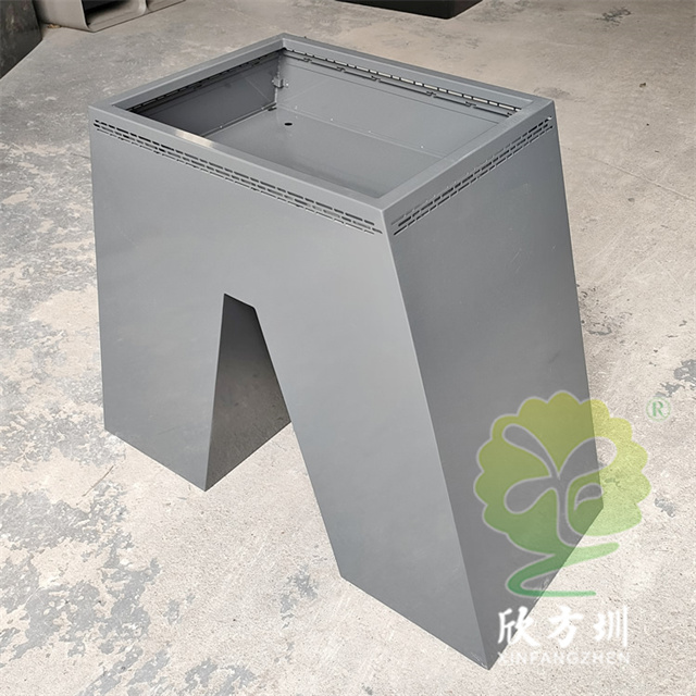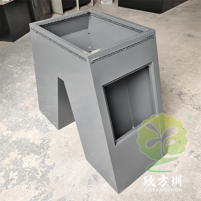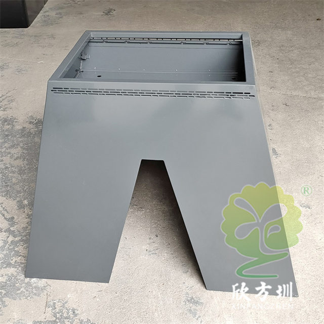 戶外公園廣場噴塑鍍鋅板花盆花箱采用優質的鍍鋅板制造而成,表面塑粉灰色噴涂噴塑,上方大號種植口鏤空,側面帶一個小的種植口,箱體底部吃地面積大很穩,花箱底部帶漏水口不易爛植物根,我們欣方圳工廠支持定制。