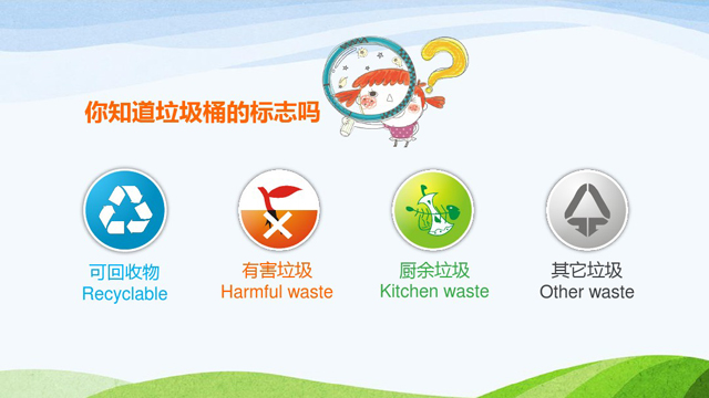 如今中古哦生活垃圾一般可分為四大類:可回收垃圾、廚余垃圾、有害垃圾和其他垃圾。目前常用的垃圾處理方法主要由:綜合利用、衛生填埋、焚燒發電、堆肥、資源返還。廢紙是我們學習容易產生的垃圾,她的回收利用價值很高:回收利用1噸廢紙可以再造出0.8噸好紙,可以挽救17棵大樹,節省3立方米的垃圾填埋廠空間,降低造紙75%的污染排放,而每張紙最少可以回收兩次!以下最新垃圾分類ppt模板由分類垃圾桶網收集整理。