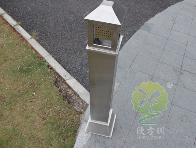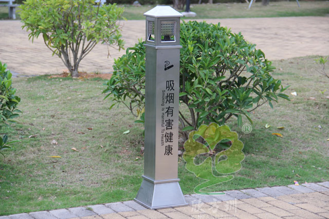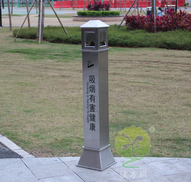 C631公共場所滅煙柱采用優質不銹鋼剪切、組裝、焊接、絲印而成,不銹鋼具有很好的堅固耐用,防水防銹,時尚美觀作用。它包括外套管、煙灰投放口、內筒、煙灰盒。外套管的底端固定連接在支座上,外套管的側壁上設有煙蒂置入口,內套管用于集中收納從外套管的煙蒂置入口投入的煙蒂,內套管設在外套管的內管腔中,內內套管的開口端朝上,煙蒂置入口與內套管的開口相連通,以使得從煙蒂置入口投入的煙蒂可從內套管的開口端落入到內套管的內管腔中。