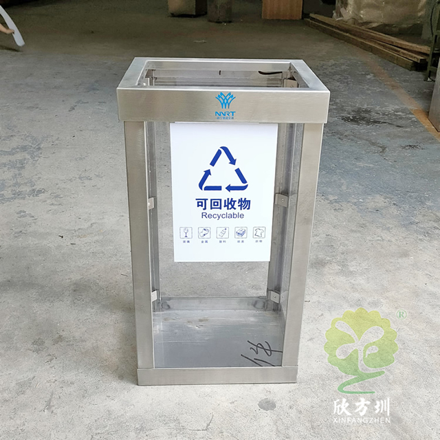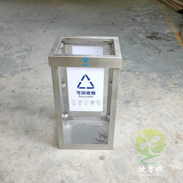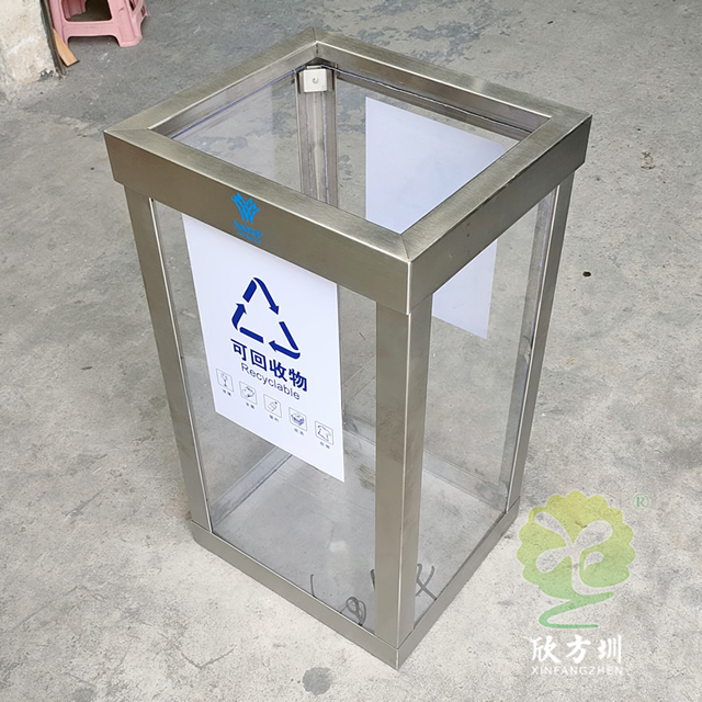 地鐵站透明防爆不銹鋼分類垃圾桶框架可以采用201或者304不銹鋼板制作,方形設計可透視看見里面的廢物,透明板材采用了亞克力板,這款垃圾桶不是真的防爆而是可以看到里面有沒有危險物品,一般都是套透明的塑料袋使用,正反面貼了一個可回收物的分類標識,里面帶螺絲帽擰開方便更換亞克力板,我們欣方圳制作過很多這種透明防爆桶基本上都是用于人群密集的地方,可以根據客戶要求定制。