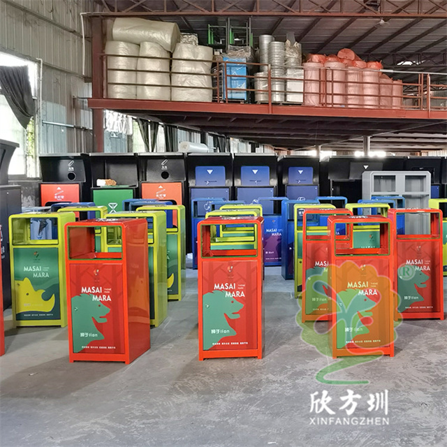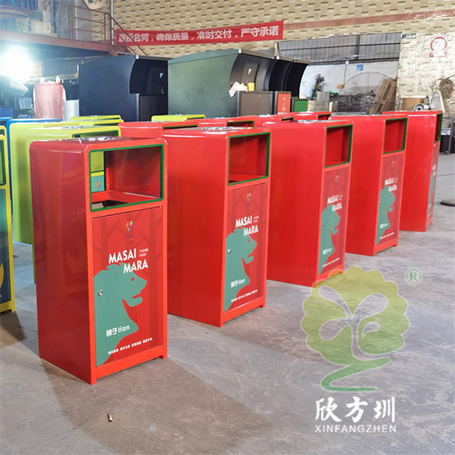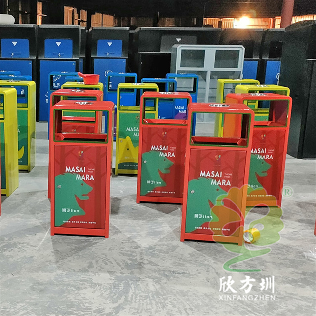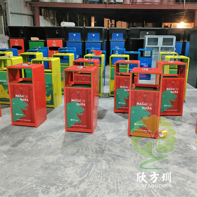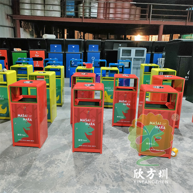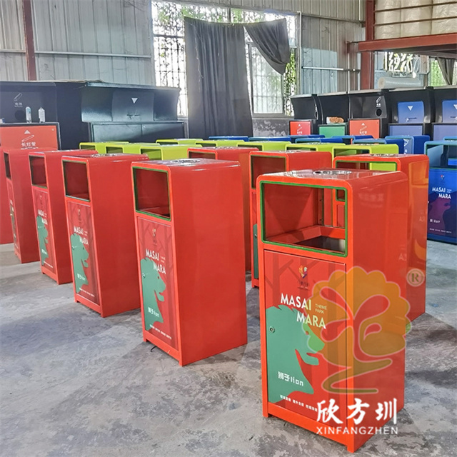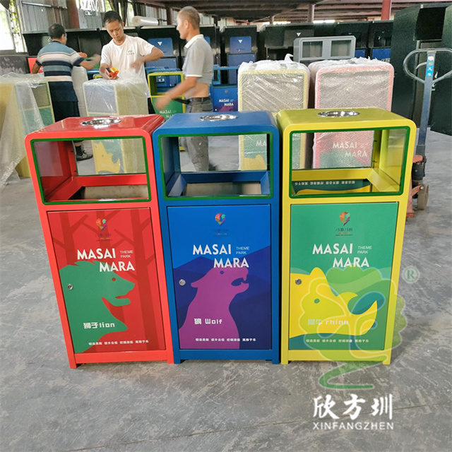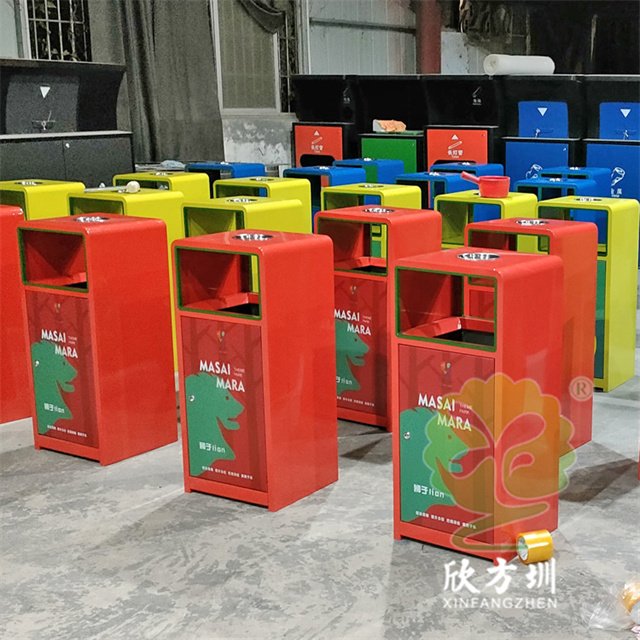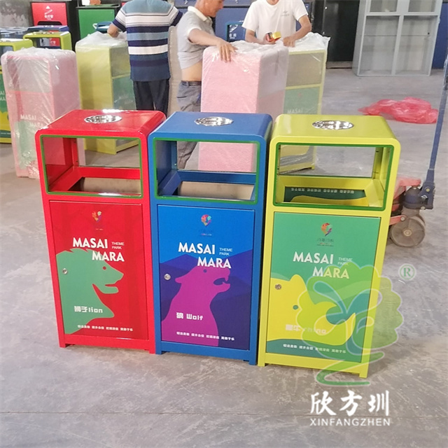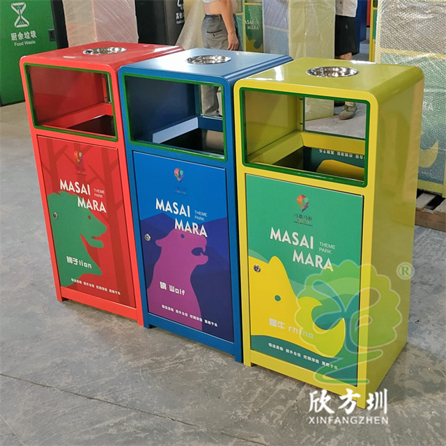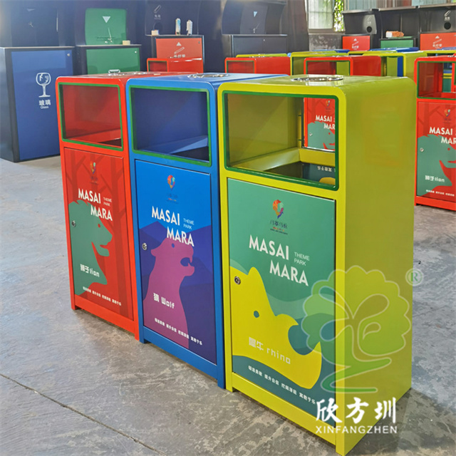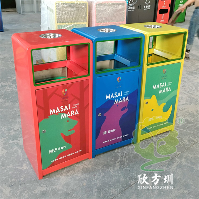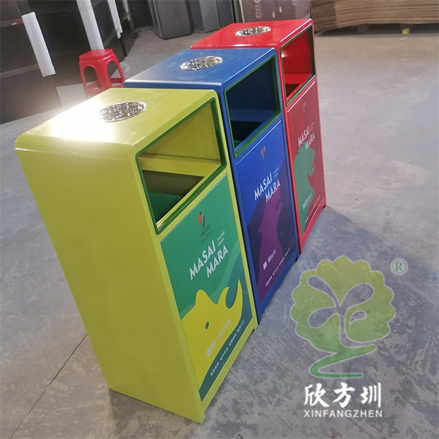 加厚組合式三色不銹鋼分類垃圾桶采用了2.00mm厚304#不銹鋼板制造而成,一般常規的不銹鋼板厚度我們廠家都會使用1.00mm厚,室外組合式方形雙面投口設計,表面采用了三色噴涂噴塑上色,垃圾桶門板應用了UV打印抽象卡通圖案,頂部中心位置帶碗形煙灰盅,門板左中間帶三角鑰匙鎖頭,我們廠家支持板材、厚度、表面工藝定制。