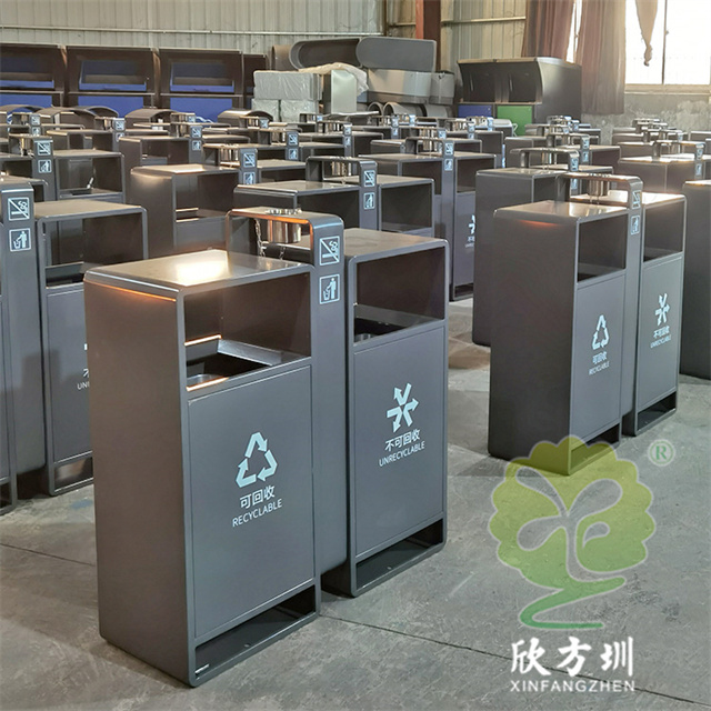 戶外小區烤漆兩分類不銹鋼垃圾桶材質采用了201不銹鋼板1.0毫米厚的,這款垃圾桶想節約成本也可以采用鍍鋅板以及熱軋鋼板制造,但是會縮短使用壽命,外觀方形兩連體設計,表面噴涂噴塑上了一層灰色的的外衣俗稱烤漆,正反面油墨絲印了可回收和不可回收的分類標識,頂部中心位置帶一個煙灰盅,門板帶三角鑰匙可開門取出內置的內筒。