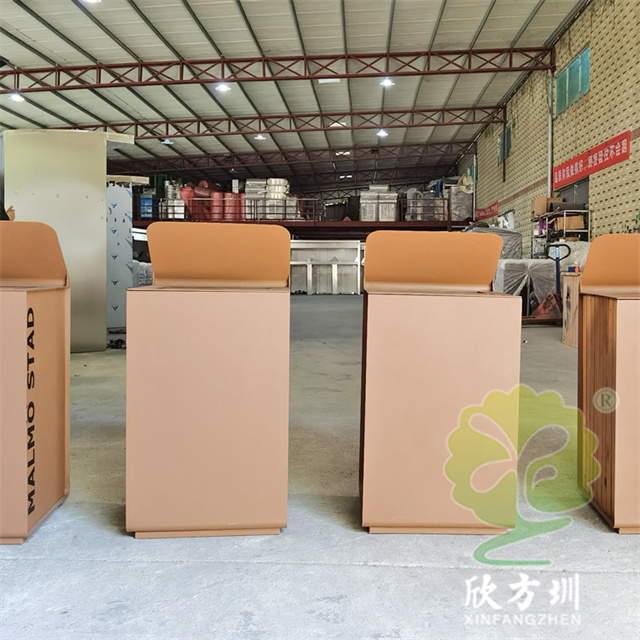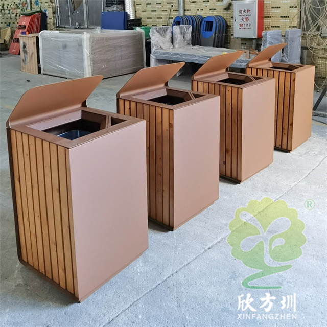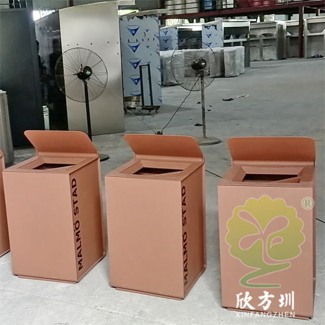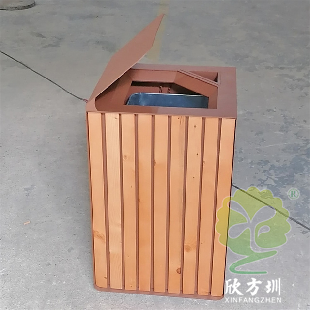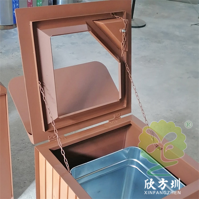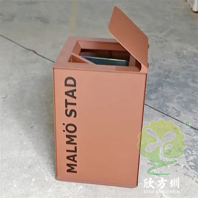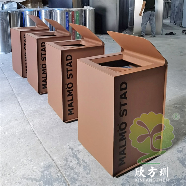 戶外貿易方形不銹鋼果皮箱單筒用201#不銹鋼1.0厚度板生產,蓋子2.5mm厚度不銹鋼板制作,蓋子坡面擋雨棚,外框噴塑烤漆巧克力色,正面的細紋不印了,用戶要求做純色即可,左右側做了凹進去的效果,左側嵌入木條,右側金屬面黑色油墨英文字母絲印。