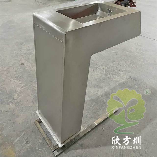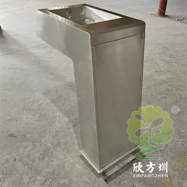 戶外園林公共不銹鋼飲水機凈水設備采用304#不銹鋼板制造而成,整體不銹鋼金屬本色,方形水盆底部鏤空方便漏水,底部一個門板可以使用三角鑰匙開門,內置帶4個濾芯過濾系統,方便更換濾芯,底部帶支架是埋入地下用水泥澆灌。