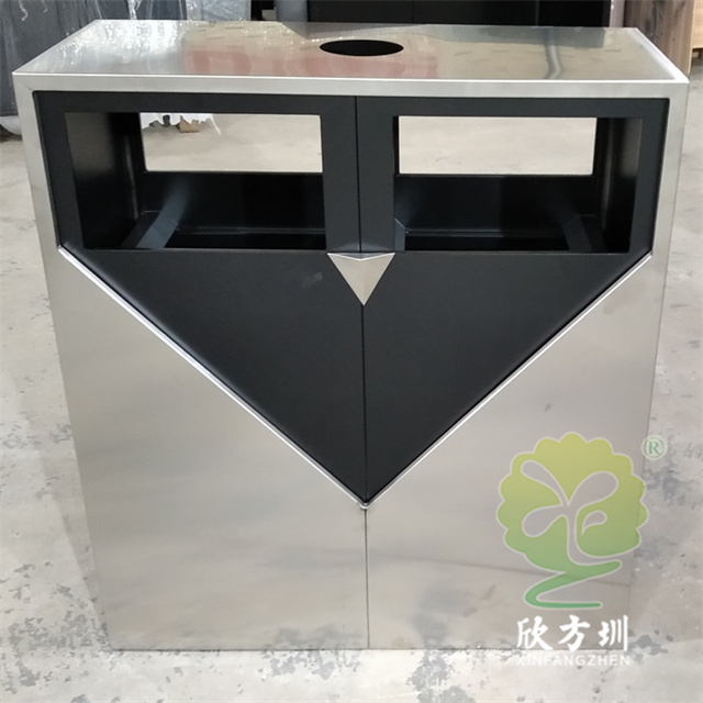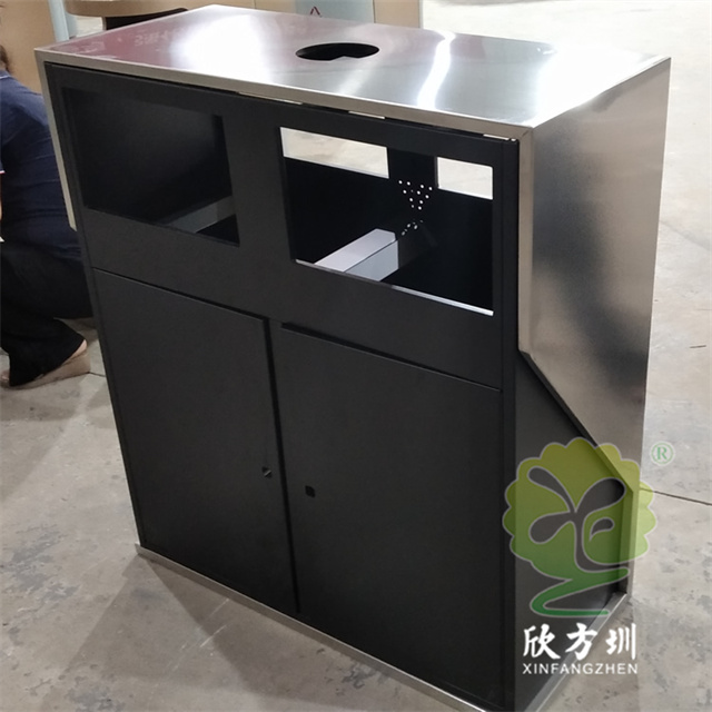戶外小區噴塑不銹鋼分類垃圾桶采用了304不銹鋼板1.0mm制造而成,室外兩連體方形設計,創意框架雙層雙層不銹鋼,內側不銹鋼黑色噴粉,頂部帶個煙灰盅,背面三角鑰匙雙開門可以取出內筒,正面絲印單色國標分類標識。