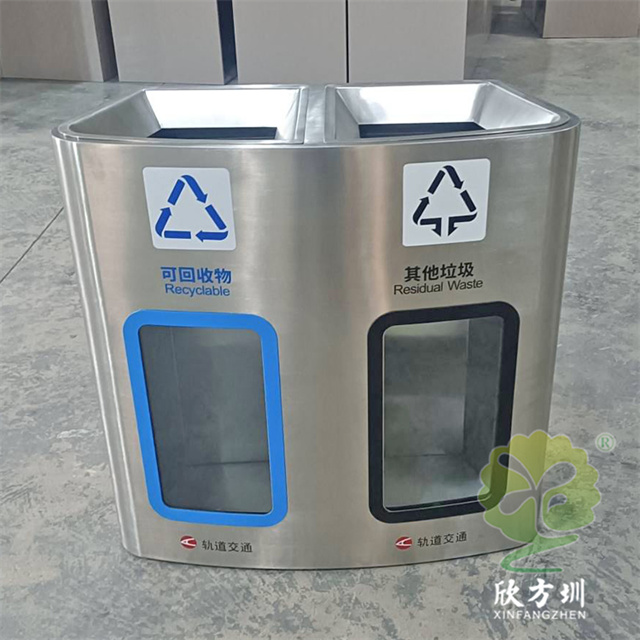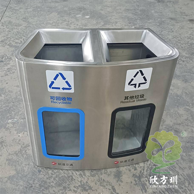 加厚地鐵站軌道交通不銹鋼分類垃圾桶,兩連體直投口設計,外筒304不銹鋼2.0mm,內筒304不銹鋼1.0mm厚度,絲網印刷分類標識和軌道交通logo,透明位置可以采用亞克力板或者鋼化玻璃,亞克力板膠條封邊。