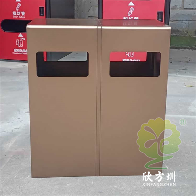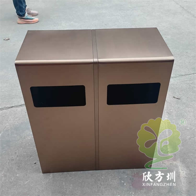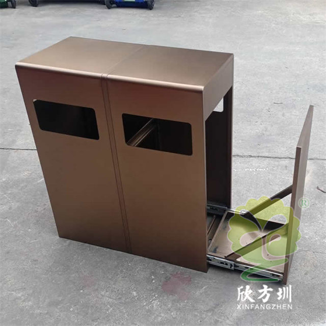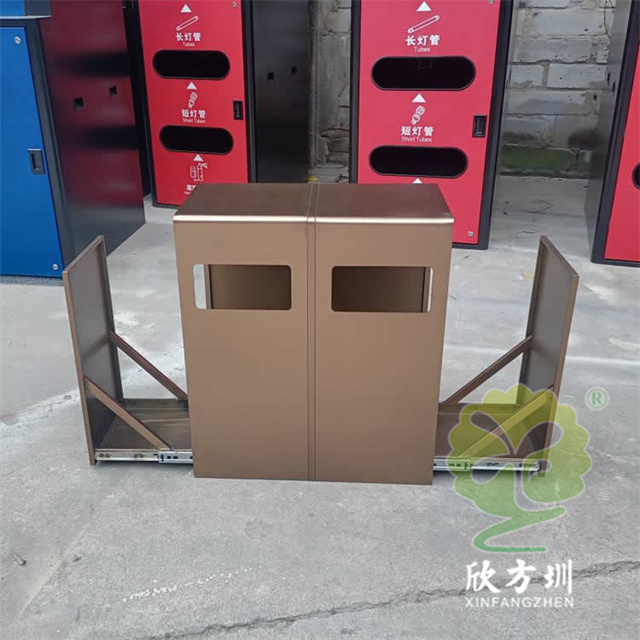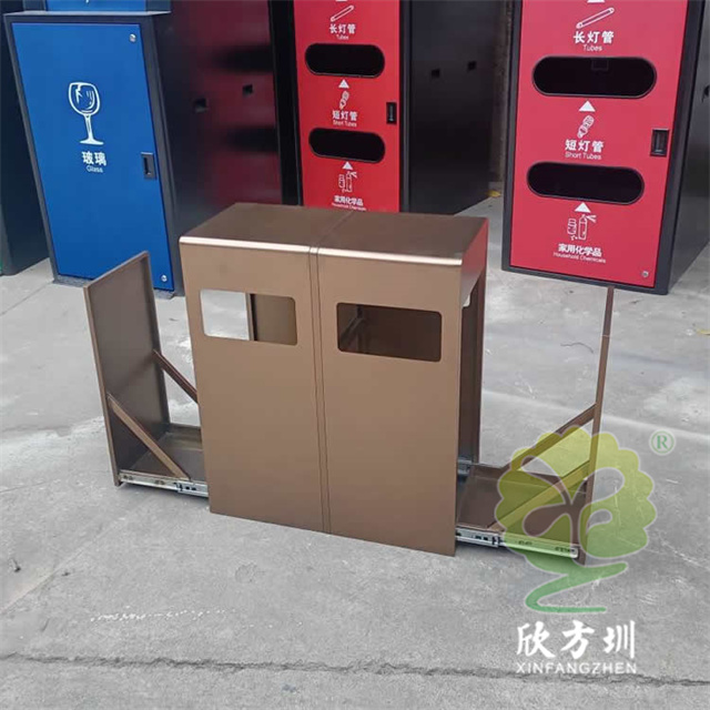 抽拉式滑軌電鍍防指紋不銹鋼分類垃圾桶采用了304不銹鋼1.5mm厚的板制作而成,側面兩連體分類抽拉式滑軌設計,果皮箱金屬表面電鍍香檳金和做防指紋處理工藝,正反面可以油墨絲網印刷國標分類標識和企業logo,可以定制本色或者噴塑桶身。