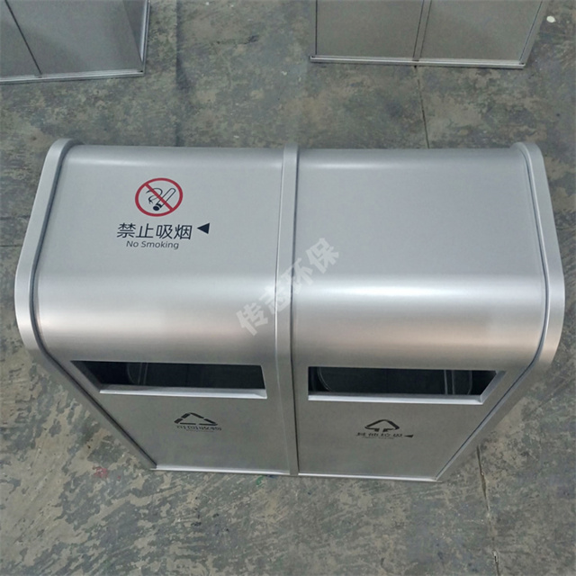 戶外銀色方形雙分類不銹鋼垃圾桶采用1.2mm厚201不銹鋼板制作而成,戶外兩連體雙分類方形設計,桶身金屬表面噴粉銀色,油墨絲網印刷最新國標分類標識及企業logo,可以定制材質厚度以及銀色或者規格,果皮箱無煙灰盅。