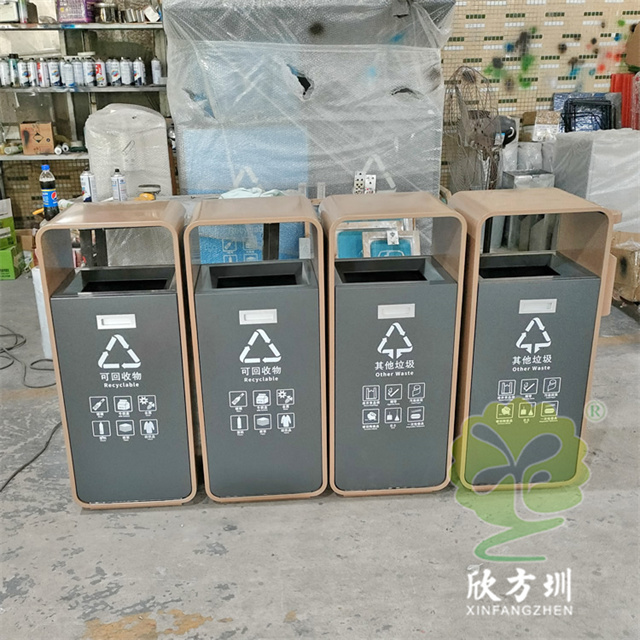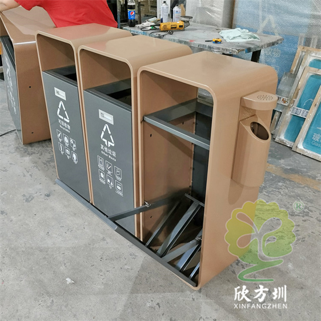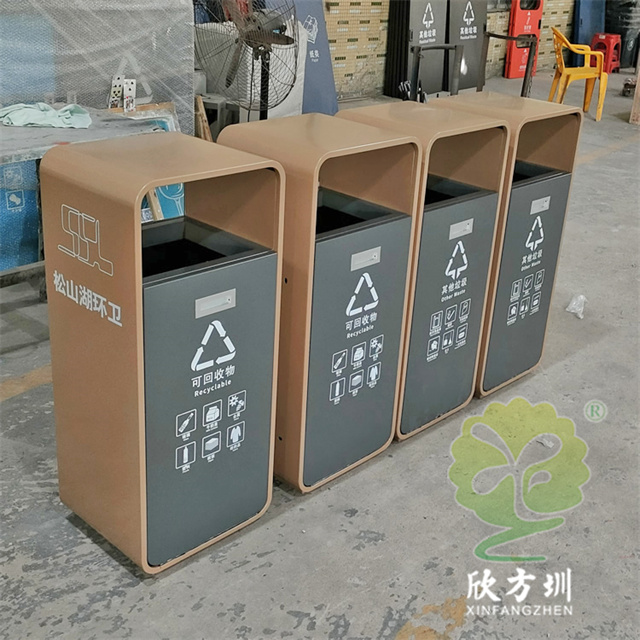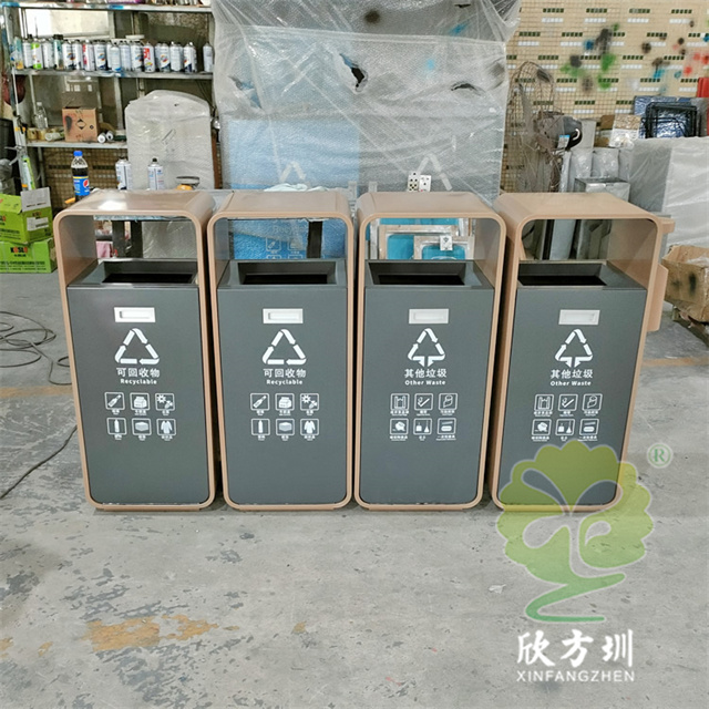 廣東松山湖環衛不銹鋼分類垃圾桶外筒201不銹鋼1.2mm電鍍,內部噴粉烤漆,可以定做尺寸跟顏色,翻到方便清理桶內廢物,可以定制絲網印刷最新國標分類標識和企業logo,側面有一個煙灰盅,4個桶內部通過螺絲連接。