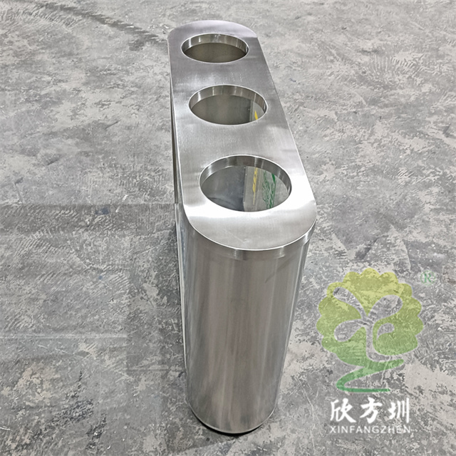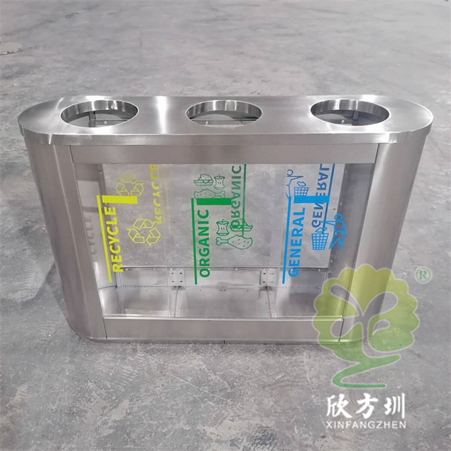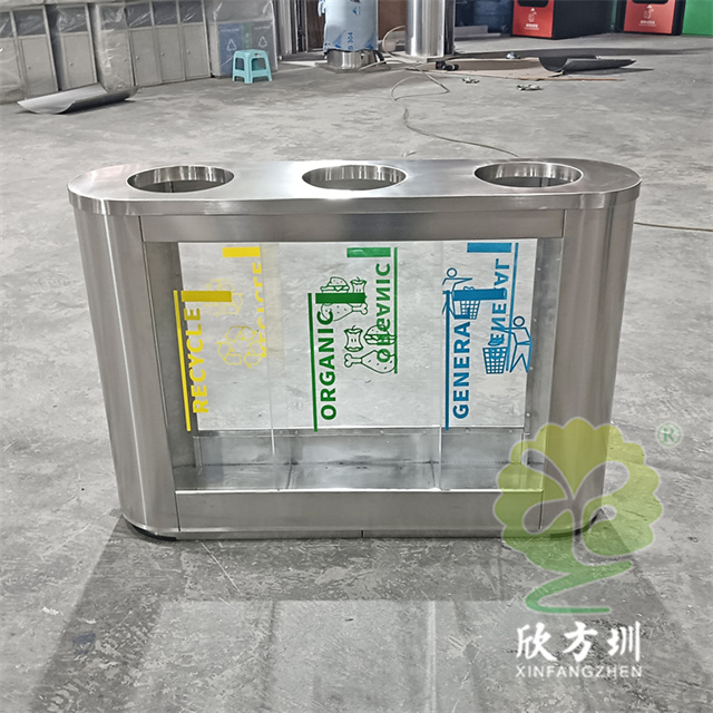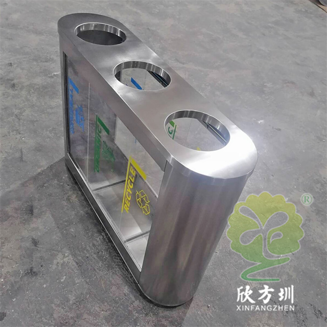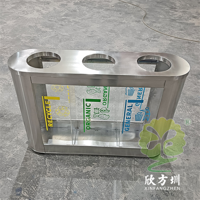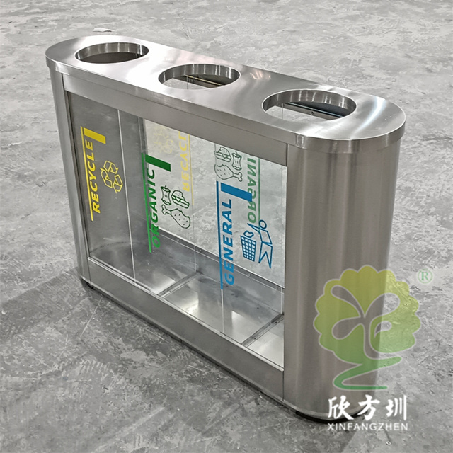 外貿(mào)室內(nèi)環(huán)衛(wèi)透明三分類不銹鋼垃圾桶可以采用201或者304不銹鋼板制作,橢圓形直投口三分類設計,透明部位可以采用亞克力板或者鋼化玻璃制作,投口帶不銹鋼鋼管壓垃圾袋,透明板可以絲網(wǎng)印刷中英文分類標識,支持定制兩分類四分類顏色尺寸或帶漏水槽,無內(nèi)筒套透明塑料垃圾袋,便于環(huán)衛(wèi)工人進行垃圾清倒,適合擺放場景:室內(nèi)機場候機廳、高鐵站候車廳、購物商場、地鐵站等等。