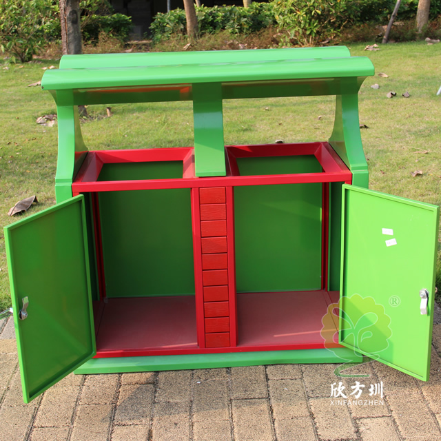 戶外園林冷軋鋼板分類垃圾箱規(guī)格:550*400*1000mm,F(xiàn)189采用優(yōu)質(zhì)冷軋鋼材料經(jīng)沖床沖孔、防銹、防腐處理后表面烤漆處理,耐火安全,抗高低溫,適合各種惡劣氣候條件,堅(jiān)固耐用,不易破損,具有款式多樣化,色澤多樣化,經(jīng)久耐用等優(yōu)點(diǎn)。垃圾回收箱底部射有螺栓孔,可將垃圾桶直接與地面固定,在一定程度上也可以防止被偷。本款垃圾回收箱表面經(jīng)過除油、噴砂防銹處理后,再進(jìn)行酸洗磷化處理;表面清理干燥后整體進(jìn)行靜電噴涂或烤漆處理,靜電噴涂是經(jīng)過流水線高溫固化爐固化后再出爐冷卻,加工后的塑粉附著力強(qiáng),不易剝落,這樣戶外防銹效果才會好。該款垃圾回收箱樣式比較簡單,是比較常見的一款戶外垃圾桶,在街道、小區(qū)、物業(yè)、廣場等等眾多的公共場合都在用此款垃圾回收箱。