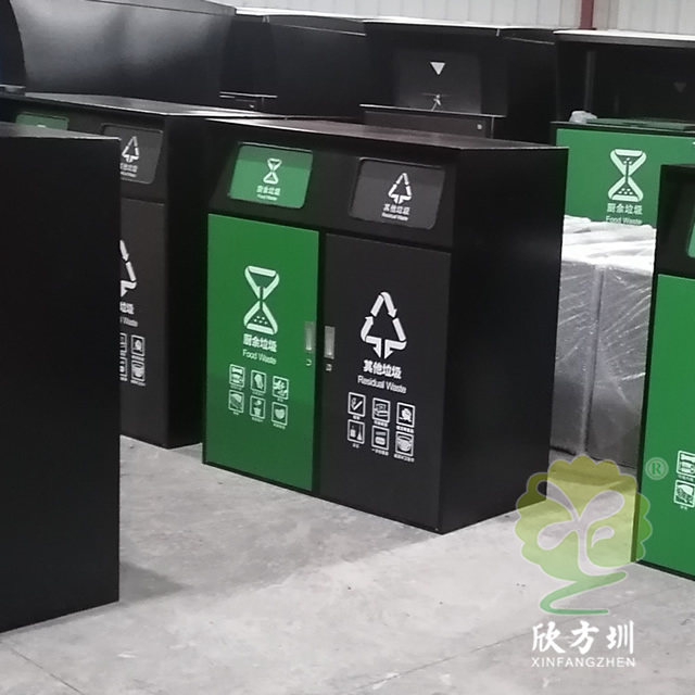 戶外組合帶蓋鍍鋅板分類垃圾桶外桶采用了鍍鋅板制作而成,兩連體組合分類方形搖擺蓋設計,外桶表面黑色噴涂噴塑,這款垃圾桶用戶是兩套組合成了四分類,門板和蓋子噴塑了不相同的顏色,廚余垃圾噴塑了綠色,其他垃圾噴塑了黑色,可回收物噴塑了藍色,有害垃圾噴塑了紅色,門板上絲印了最新國標分類標識,可以使用三角鑰匙開門取出內筒。